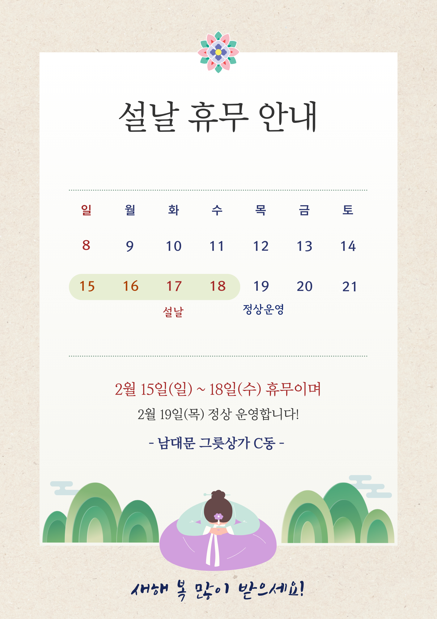MON - SAT 09 : 00 ~ 18 : 00 (SUNDAY OFF)